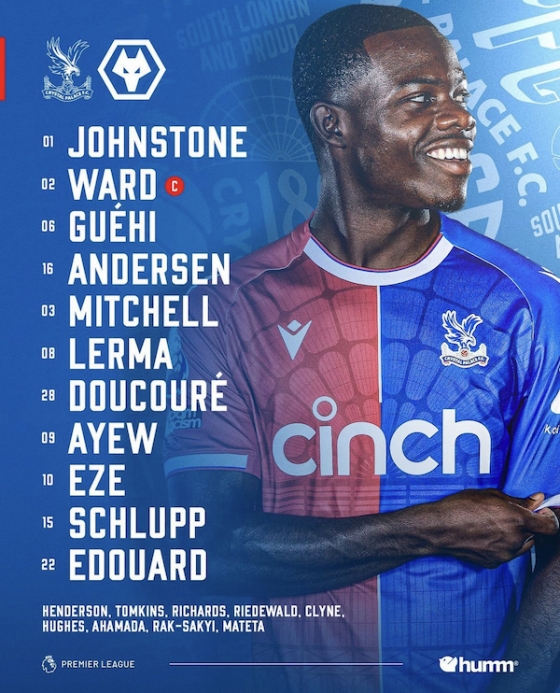 홈팀 크리스탈 팰리스는 4-2-3-1 포메이션을 꺼냈다. 최전방에 오드손 에두아르, 2선엔 제프리 슐럽-에베리치 에제-조던 아예우가 나왔다. 셰이크 두쿠레와 에메르손 레르마가 수비형 미드필더로 나섰다. 포백은 타이릭 미첼-마크 게히-요아킴 안데르센-조엘 워드(C)가 호흡을 맞췄다. 존 스톤스가 골키퍼 장갑을 꼈다.