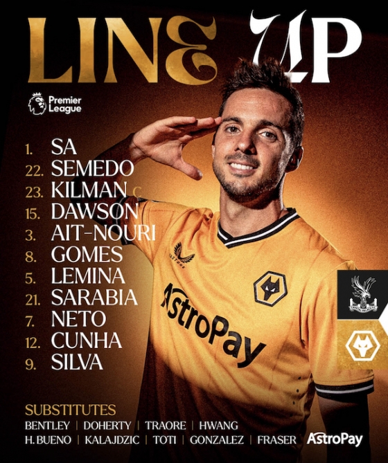 원정팀 울버햄튼은 4-4-1-1 전형을 들고나왔다. 최전방에 파비우 실바가 섰고 그 밑을 마테우스 쿠냐가 받쳤다. 전 중원엔 파블로 사라비아-마리오 르미나-주앙 고메스-페드루 네투가 출전했다. 라얀 아이트-누리-막시밀리안 킬먼(C)-크레이그 도슨-넬송 세메두가 수비를 구성했다. 골키퍼는 조세 사였다.