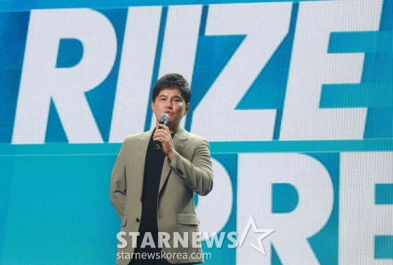 김형국 총괄 디렉터가 4일 오후 서울 용산구 블루스퀘어에서 진행된 SM엔터테인먼트 신인 그룹 라이즈(RIIZE)의 첫 싱글 '겟 어 기타'(Get A Guitar) 발매 기념 쇼케이스에서 발표를 하고 있다.