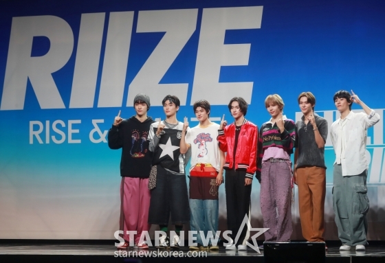 SM엔터테인먼트 신인 그룹 라이즈(RIIZE)가 4일 오후 서울 용산구 블루스퀘어에서 진행된 첫 싱글 '겟 어 기타'(Get A Guitar) 발매 기념 쇼케이스에서 포즈를 취하고 있다.
