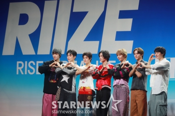 SM엔터테인먼트 신인 그룹 라이즈(RIIZE)가 4일 오후 서울 용산구 블루스퀘어에서 진행된 첫 싱글 '겟 어 기타'(Get A Guitar) 발매 기념 쇼케이스에서 포즈를 취하고 있다.