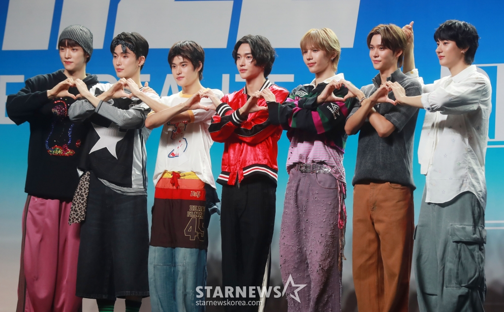 SM엔터테인먼트 신인 그룹 라이즈(RIIZE)가 4일 오후 서울 용산구 블루스퀘어에서 진행된 첫 싱글 '겟 어 기타'(Get A Guitar) 발매 기념 쇼케이스에서 포즈를 취하고 있다.