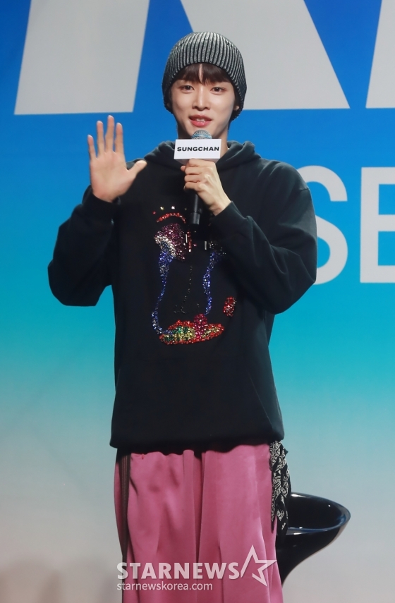 SM엔터테인먼트 신인 그룹 라이즈(RIIZE) 성찬이 4일 오후 서울 용산구 블루스퀘어에서 진행된 첫 싱글 '겟 어 기타'(Get A Guitar) 발매 기념 쇼케이스에서 인사말을 하고 있다.
