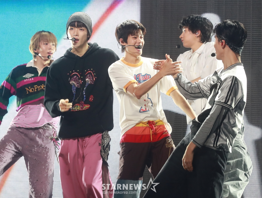 SM엔터테인먼트 신인 그룹 라이즈(RIIZE)가 4일 오후 서울 용산구 블루스퀘어에서 진행된 첫 싱글 '겟 어 기타'(Get A Guitar) 발매 기념 쇼케이스에서 신곡을 선보이고 있다.
