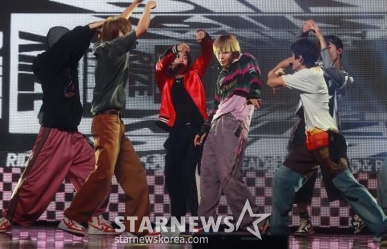 SM엔터테인먼트 신인 그룹 라이즈(RIIZE)가 4일 오후 서울 용산구 블루스퀘어에서 진행된 첫 싱글 '겟 어 기타'(Get A Guitar) 발매 기념 쇼케이스에서 신곡을 선보이고 있다.