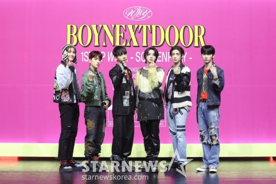 보이그룹 보이넥스트도어(BOYNEXTDOOR)가 4일 오후 서울 광진구 광장동 예스 24라이브홀에서 미니 1집 'WHY..' 발매 기념 쇼케이스에 참석해 포즈를 취하고 있다.