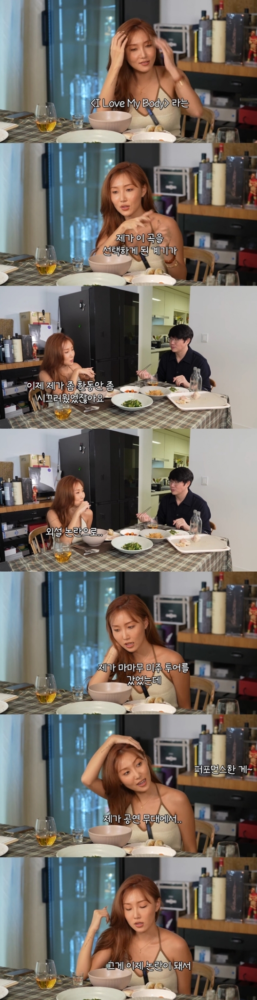 이어 그는 "그래서 그렇게 미주투어 보내다가. 갑자기 싸이 오빠한테 연락이 왔어요"라면서 "그때도 조금 우울하고, 나 앞으로 무슨 노래를 해야되지. 고민에 차 있고, 미래가 막연해질 때가 그 날이었거든요. 그때 피네이션 계약하고 이런 것도 아니었는데. 이제 오빠가 '굿 뉴스야. 노래 좀 들어볼래?'하면서 노래를 보내줬어요. 그게 이제 'I Love My Body'였다. 그런데 이제 딱 들었는데, 처음으로 웃었던 거 같아요"라고 덧붙였다.