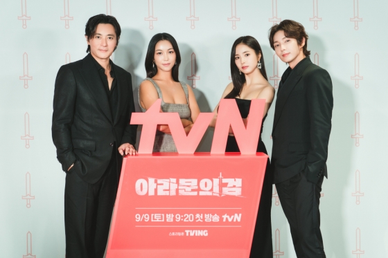 5일 오후 네이버TV, 티빙을 통해 tvN 새 토일드라마 '아라문의 검'(극본 김영현·박상연, 연출 김광식, 기획 스튜디오드래곤, 제작 스튜디오드래곤·KPJ) 온라인 제작발표회가 진행됐다. 제작발표회에는 집필을 맡은 김영현, 박상연 작가를 비롯해 김광식 감독, 배우 장동건, 이준기, 신세경, 김옥빈이 참석했다.