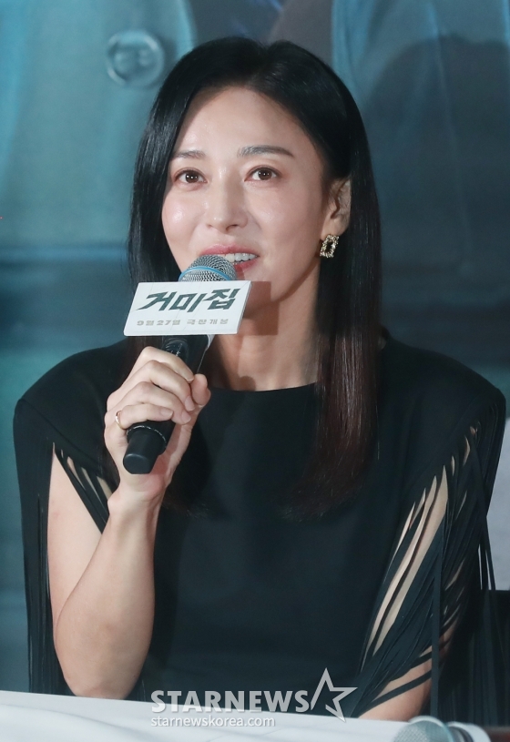 배우 장영남이 14일 오후 서울 강남구 메가박스 코엑스에서 진행된 영화 '거미집'(감독 김지운) 언론시사회에 참석해 질문에 답하고 있다.