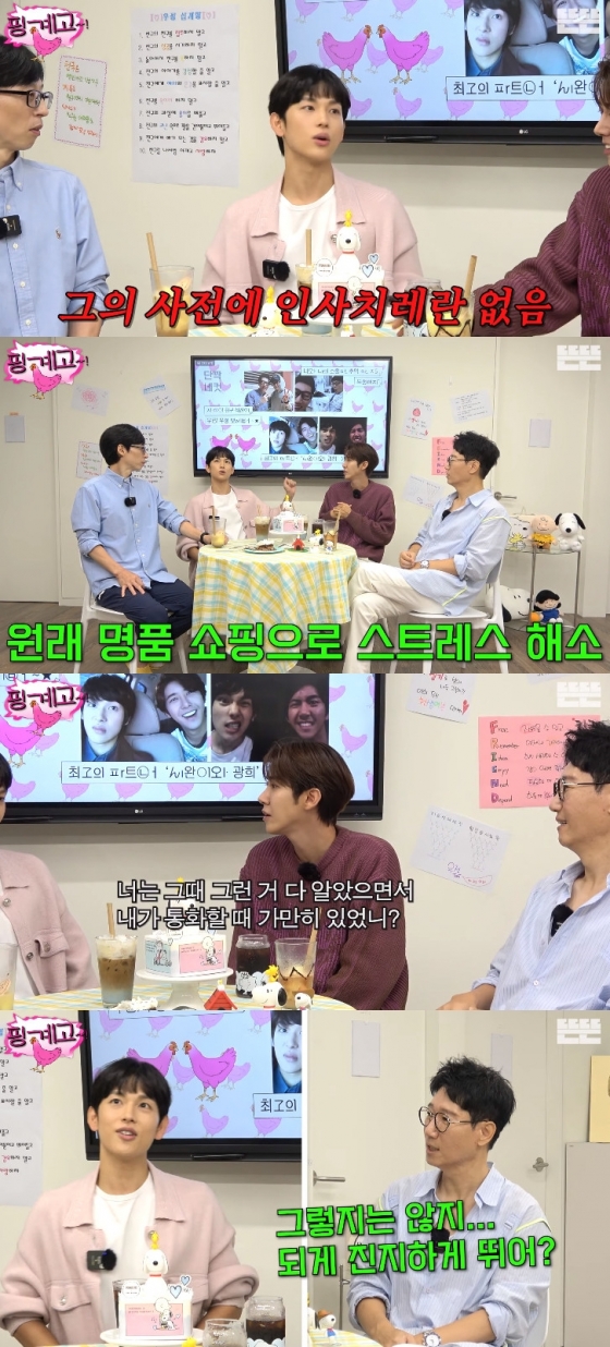 또한 광희는 "제가 (임) 시완이한테 전화해서 가르치려는 습관이 있다. 얘는 그걸 잘 받아주는 편이다. 지난 겨울에 시완이한테 '외국 나갈 준비해. 글로벌하게 나가려면 영어 공부해'라고 했다. 근데 '오징어 게임2'에 합류한다고 하더라. 그것도 모르고 잔소리했다"고 창피해했다. 이에 임시완은 "출연 소식에 대한 엠바고가 있었다"고 했고, 광희는 엠바고를 알아듣지 못해 웃음을 안겼다.
