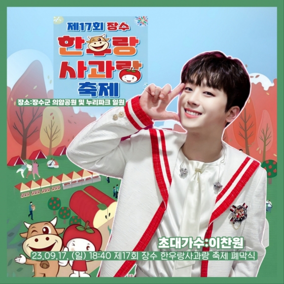 이찬원은 17일 오후 6시 30분 전북 장수군 의암공원과 누리파크 일원에서 열리는 '제17회 장수 한우랑 사과랑 축제'에 출연해 무대를 펼칠 예정이다.