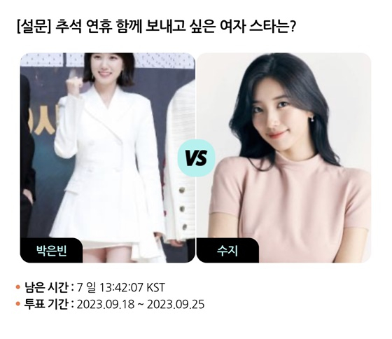 추석 연휴 함께 보내고 싶은 여자 스타를 뽑는 이색 설문이 진행 중이다.