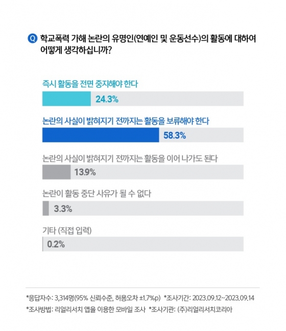 결과에 따르면 학교폭력 가해 논란의 유명인(연예인 및 운동선수)의 활동에 대해 어떻게 생각하는지 묻자 '논란의 사실이 밝혀지기 전까진 활동을 보류해야 한다'는 응답이 58.3%로 과반수 이상을 차지한 것으로 나타났다.