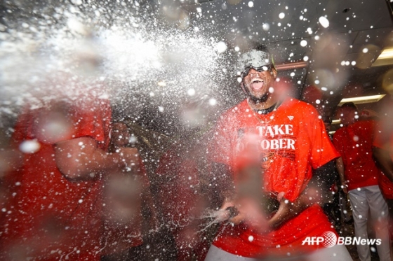 볼티모어 선수단이 18일(한국시간) 포스트시즌 진출을 확정한 뒤 샴페인 파티를 하고 있다. /AFPBBNews=뉴스1