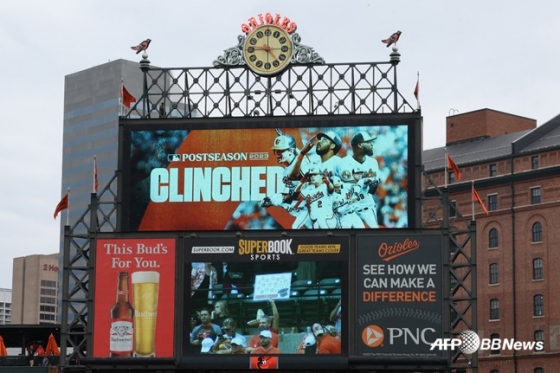 18일(한국시간) 볼티모어의 홈 구장인 캠든 야즈에 포스트시즌 진출 확정 이미지가 송출되고 있다. /AFPBBNews=뉴스1