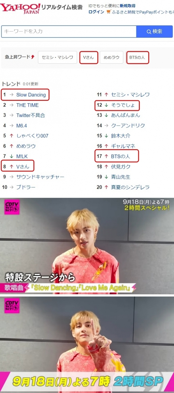 뷔의 무대가 끝난 후 야후 재팬 실시간 검색어에는 ''Slow Dancing'이 1위에 올랐으며 V, 뷔가 인터뷰에서 말한 '쇼우데쇼' 'BTS의 사람'등이 차지했다.