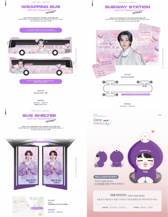 뿐만 아니라 지민을 캐릭터화한 대형 벌룬 포토존을 꾸민 명동에 이어 도쿄에서도 생일 기념 테마로 예쁘게 단장한 카페를 운영할 계획으로 보다 많은 팬들이 '기쁨이 온 날'을 함께 축하할 수 있도록 배려했다.