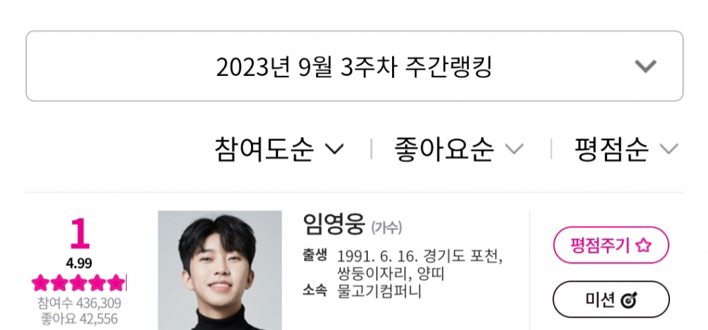 임영웅은 9월 15일부터 9월 21일까지 집계된 9월 3주차 아이돌차트 평점랭킹에서 43만 6309표를 얻어 1위를 차지했다.