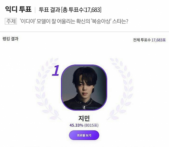 지민은 지난 9월 10일부터 9월 16일까지 익사이팅 디시에서 진행된 ''이디야' 모델이 잘 어울리는 확신의 '복숭아상' 스타는?' 투표 결과 1위를 차지했다.