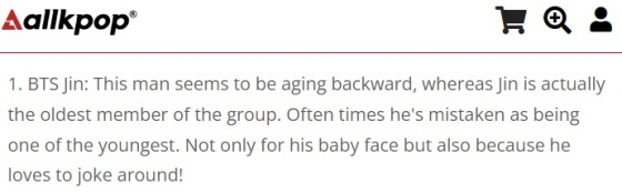 올케이팝은 첫번째로 방탄소년단 진을 뽑았다. 매체는 진이 나이를 거꾸로 먹는 것처럼 보이지만 사실 이 그룹에서 맏이인 멤버라고 소개했다. 진은 종종 막내로 오해를 받기도하는데, 베이비페이스를 가졌을 뿐 아니라 농담하는 것도 좋아한다며 첫번째 스타로 언급했다.