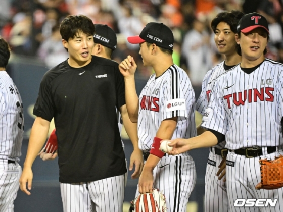 LG 임찬규(왼쪽)가 23일 한화전을 마친 뒤 동료들과 이야기를 나누고 있다.