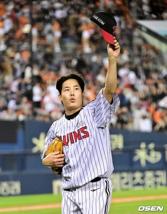8회초. 여전히 마운드에는 LG 선발 임찬규가 서 있었다. 2아웃까지 잘 잡은 뒤 이도윤에게 안타를 내준 임찬규. 그리고 후속 박상언과 풀카운트 승부 끝에 8구째 회심의 커브를 뿌렸다. 큰 곡선을 그리며 떨어진 공에 박상언의 배트가 헛돌았다. 홀로 8이닝 완벽투를 책임진 순간. 그의 96번째 공. 그리고 임찬규는 주먹을 휘저으며 힘차게 포효한 뒤 옆으로 겅충겅충 뛰면서 더그아웃으로 향했다. 그런 임찬규를 향해 LG 팬들이 '임찬규'를 연호하며 뜨거운 함성을 보냈다. 임찬규는 모자를 벗은 뒤 감사의 인사를 건넸다. 임찬규가 또 한 번 뭉클한 인생투를 펼친 순간이었다.