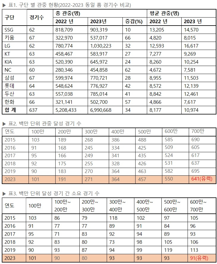이날(24일) 경기가 정상 개최될 시 2019시즌 이후 4년 만에 700만 관중 돌파가 유력하다. 2023 KBO 리그는 전날(23일)까지 637경기에 누적 관중 699만 668명이 입장해 700만 관중까지 9332명을 남겨두고 있다. 이날 700만 관중을 돌파하게 될 경우 시즌 641경기, 지난 8월 31일 600만 관중 관중 달성 후 91경기만에 700만 관중을 돌파하게 된다.