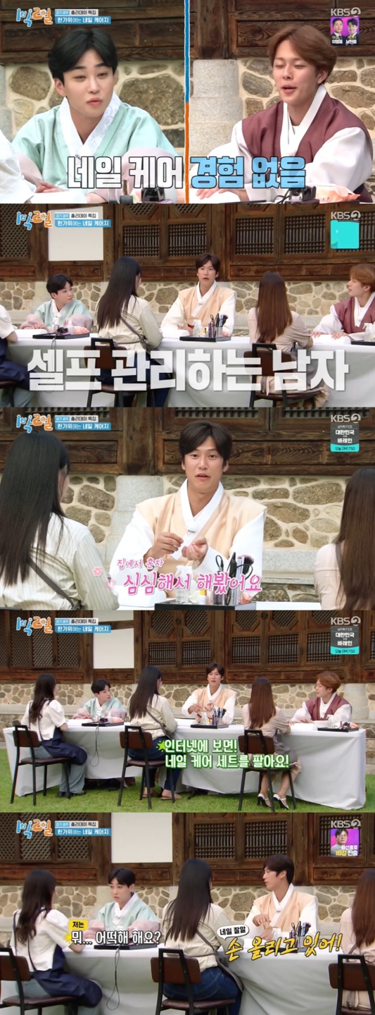 난생처음 받는 네일 케어에 어리둥절해 있는 두 사람과 달리 나인우는 "집에서도 혼자 해봤다"라며 반가워하는 모습을 보였다. 이에 문세윤이 "물어뜯는 건 케어가 아니다"라며 비아냥댔지만 나인우는 "인터넷에서 보면 세트를 판다. 그래서 혼자 심심해서 해봤다"라며 실제 후기를 전했다.