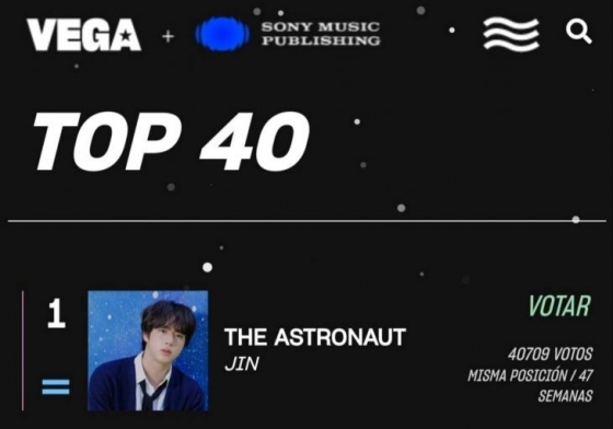 진의 '디 애스트로넛'은 지난주 아르헨티나 '베가 라디오(Vega Radio)'에서 진행한 'KPOP TOP40 랭킹'에서 47주간 1위를 차지하며 롱런 기록을 이어가고 있다.