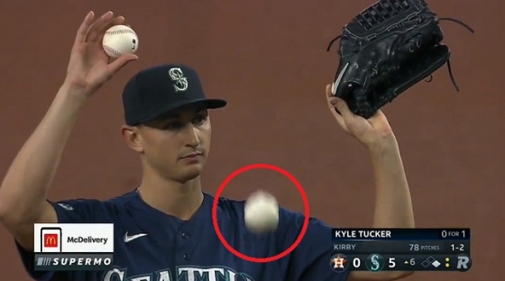 문제의 장면은 6회 초에 나왔다. 선두타자 호세 알투베에게 안타를 맞았지만 이후 두 타자를 뜬공과 삼진으로 처리하며 2아웃을 잡은 그는 카일 터커와 승부를 펼쳤다. 그런데 볼카운트 1볼 1스트라이크에서 3구째 파울이 나온 후, 투구를 준비하던 커비에게 어디선가 갑자기 공이 날아들었다. 공은 그대로 복부를 때렸고, 피해자(?) 커비는 어리둥절한 표정을 지었다.