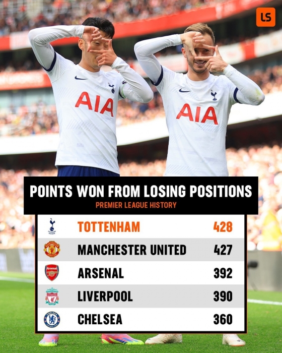 토트넘이 맨체스터 유나이티드를 제치고 1위를 차지했다. 지고 있다가 획득한 승점은 총 428점이다.