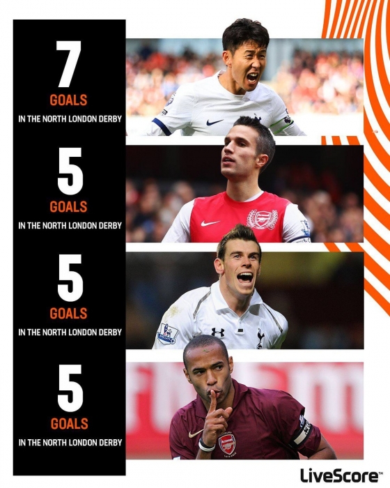 손흥민은 아스널과의 북런던 더비에서 7골을 기록했다. 이는 5득점의 로빈 반 페르시, 가레스 베일, 티에리 앙리보다 많다.