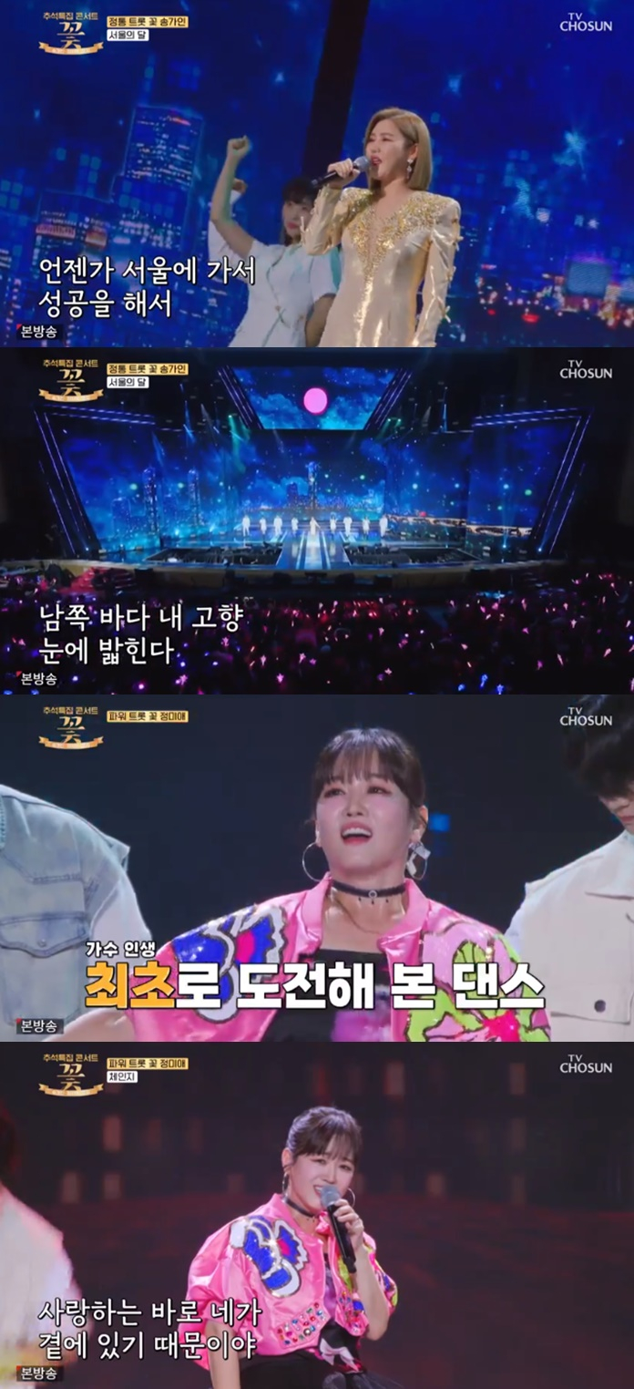 가수 송가인, 정미애, 홍자가 추석을 맞이해 종합 선물 세트 같은 무대를 선보였다.