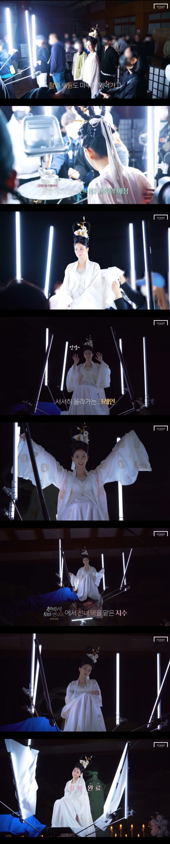 소속사가 공개한 영상에는 지수가 지난 27일 개봉한 '천박사 퇴마 연구소: 설경의 비밀'(이하 '천박사')에 선녀 역으로 등장하기 위해 촬영한 모습이 있었다.