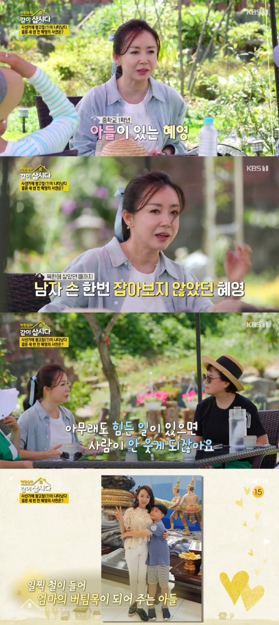 이날 김혜영은 "저는 세 번 다녀왔고, 중학교 1학년 아들이 있다"며 "귀순한 지는 25년 됐다. 북한에서 25년 살고, 한국에서 25년 살았다. 남자 손 한번 잡아본 적이 없다. 북한에서는 키스 한번 하면 결혼한다고 생각한다. 그렇게 생각하고, 여기 와서 4년 만에 남자를 만났는데 너무 좋은 사람이었다. 순애보 스타일이고, 가정적이었는데 제가 너무 잘 나갈 때였다"고 밝혔다.