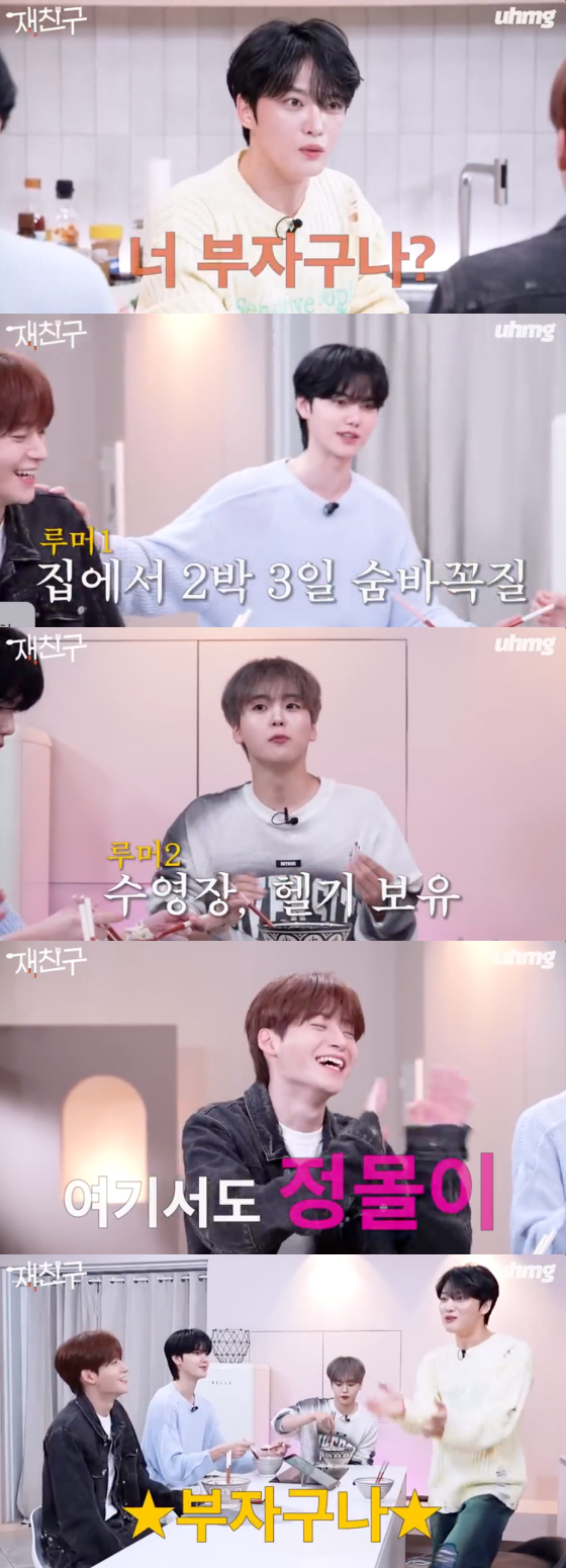 김재중은 이어 "정모 고향이 어디냐"고 물었고, 정모는 "서울 서초다"며 "외아들"이라 밝혀 눈길을 모았다. 김재중은 이에 "그럼 너 재산이 좀 있겠다"며 눈을 빛내 폭소를 자아냈다. 민희는 이에 "여기 집 가면 집에서 숨바꼭질 2박 3일 가능하다"고, 형준은 "집에 헬기 있고 수영장 있고 다 있다"고 모함해 웃음을 더했다.
