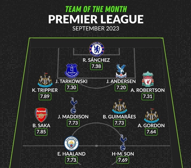 또 부카요 사카(아스널), 브루노 기마랑이스, 앤서니 고든(이상 뉴캐슬)이 미드필더 포지션으로서 9월 베스트11에 선정됐다. 수비수로는 키에런 트리피어(뉴캐슬), 제임스 타코우스키(에버턴) 요하킴 안데르센(크리스탈 팰리스), 앤디 로버트슨(리버풀), 골키퍼로는 로베르트 산체스(첼시)가 포함됐다. 뉴캐슬 선수가 3명으로 가장 많이 뽑혔다.