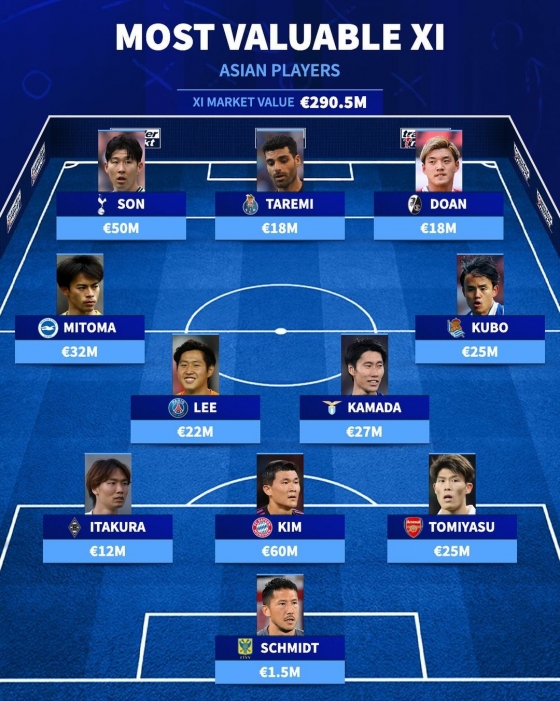 유럽 축구 통계 매체 ‘트랜스퍼마크트’는 지난 1일(현지시간) 아시아 선수들 중 포지션 마다 가치 가 높은 선수들로 라인업을 꾸렸다.