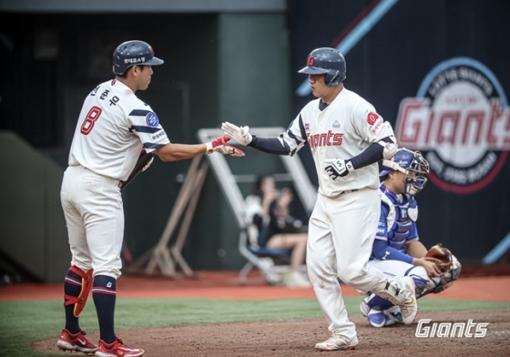 롯데 정훈(왼쪽)이 3일 사직 삼성전에서 8회 말 솔로홈런을 터트린 뒤 하이파이브를 하고 있다. /사진=롯데 자이언츠