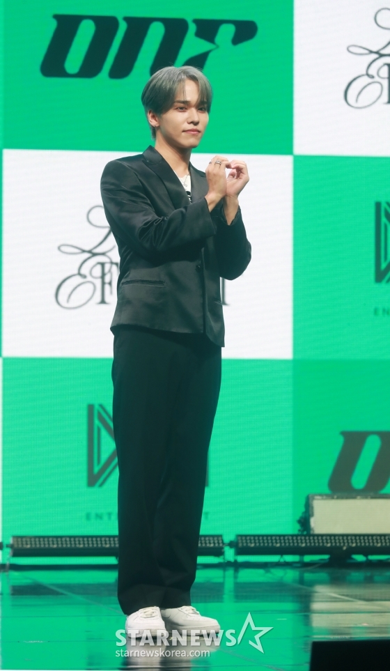 그룹 온앤오프(ONF) 유가 4일 오후 서울 마포구 신한PLAY 스퀘어에서 진행된 일곱 번째 미니 앨범 '러브 이펙트'(LOVE EFFECT) 발매기념 쇼케이스에서 포즈를 취하고 있다.