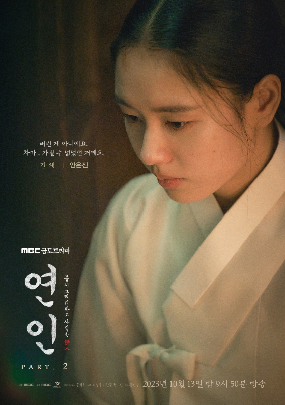 유길채가 웃는 얼굴을 보고 싶었다는 이장현. 이장현을 버린 것이 아니라 차마 가질 수 없었다는 유길채. '연인' 파트2 이장현, 유길채의 캐릭터 포스터는 슬프도록 아름답고, 가슴 시릴 만큼 애틋한 사랑을 극적으로 담아냈다. 파트1을 통해 두 사람의 사랑을, 두 배우의 열연을 지켜본 시청자들은 둘의 사랑을 더욱 애타는 마음으로 응원하며 파트2 첫 방송을 기다리게 됐다.
