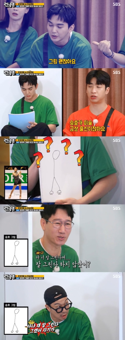 이어 유승호 팀의 차례가 됐고, 유승호는 제시어로 피겨 스케이트 선수 '김연아'를 받았다. 유승호는 자신 있게 그림을 그려나갔다. 그동안 유수빈은 "승호가 금상 대회 출신이다"라고 거들어 유승호의 그림 실력을 더욱 기대하게 했다. 그러나 유승호 다음 주자였던 지석진은 유승호가 그린 김연아의 그림을 보고 당황한 기색을 감추지 못했다. 유승호가 김연아를 졸라맨으로 그렸기 때문. 이에 지석진은 "야 이게 뭐야. 너 잘 그린다며"라며 야유했다.