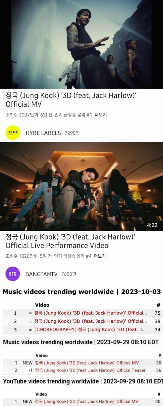 지난 9월 29일 하이브 레이블즈 공식 유튜브 채널에 공개된 정국의 솔로 싱글 '3D'의 뮤직비디오는 조회수 3000만을 돌파했다.