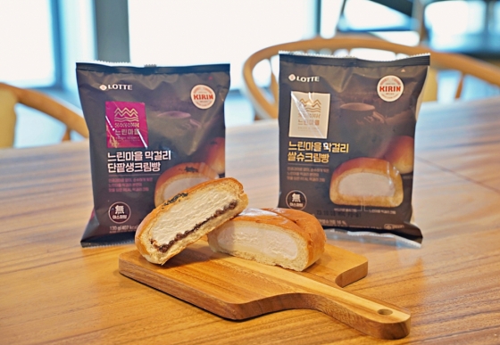 롯데웰푸드의 양산빵 브랜드 '기린'(KIRIN)이 배상면주가 '느린마을막걸리'와 손을 잡고 '느린마을막걸리 단팥생크림빵', '느린마을막걸리 쌀슈크림빵' 등 2종을 선보였다고 12일 밝혔다.