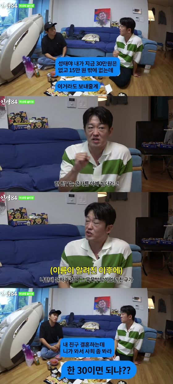 이를 들은 허성태는 두 명의 친구와 관련된 일화를 공개했다. 그는 "무명 때 내가 너무 힘들어서 두 명의 친구에게 '정말 미안한데 혹시 30만원만 빌릴 수 있을까' 했다"고 말했다.
