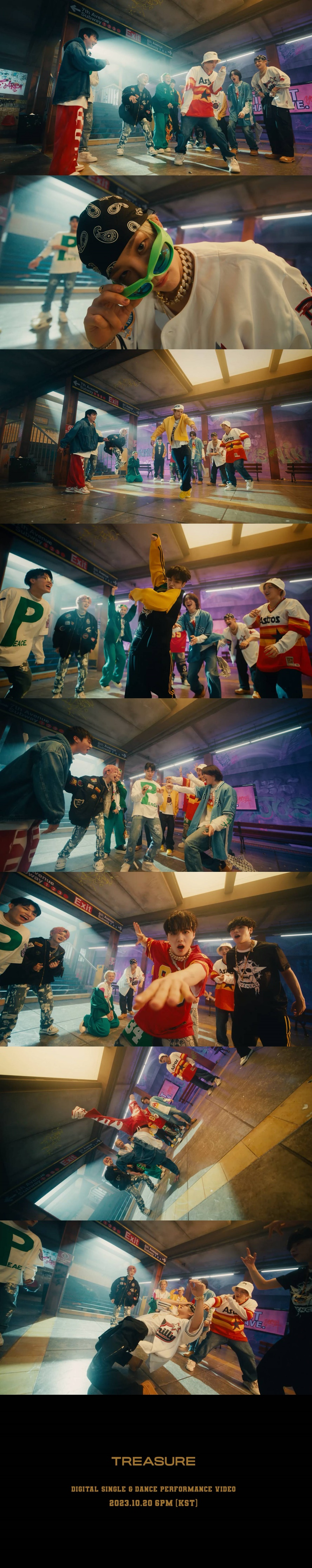 트레저는 벽 곳곳 그래피티가 그려진 지하철 플랫폼 세트장에서 스트릿 감성이 물씬 느껴지는 스타일로 등장했다. 이어 10인 10색 릴레이 프리스타일 댄스를 펼치며 숨겨왔던 힙합 바이브를 분출, 고난도 동작들까지 완벽하게 소화하며 연신 눈길을 사로잡았다.
