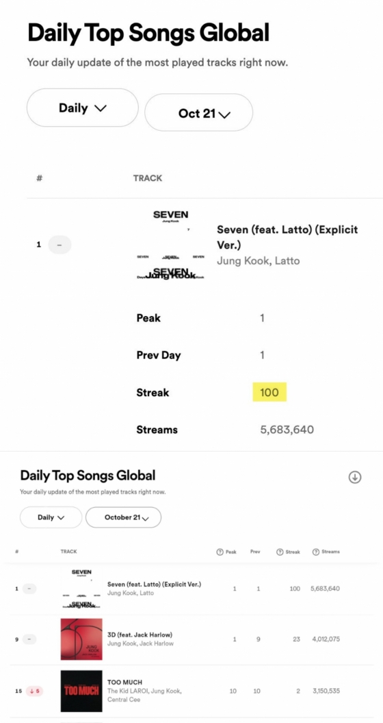 이와 함께 정국은 10월 20일 자 '데일리 톱 송 글로벌' 차트에 'Seven' 1위를 비롯해 두 번째 솔로 싱글 '3D' 9위 및 더 키드 라로이(The Kid LAROI)X센트럴 씨(Central Cee)와의 협업곡 'TOO MUCH'(투 머치) 10위 등 총 3곡을 톱10에 포진시켰다. 정국은 해당 차트 10위권에 3곡을 동시에 올린 최초의 K팝 솔로 아티스트 기록도 세우게 됐다.
