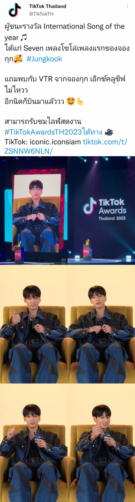 정국은 "'2023 틱톡 태국 어워드'에서 제 노래 'Seven'을 올해의 베스트 인터내셔널 송으로 만들어주셔서 감사합니다. 응원해주셔서 정말 감사드립니다. 감사합니다"라고 영상 메시지로 소감을 전했다.