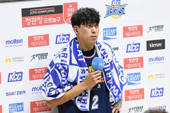 KCC 최준용이 17일 소노와 홈경기 승리 후 방송 인터뷰를 하고 있다. /사진=KBL