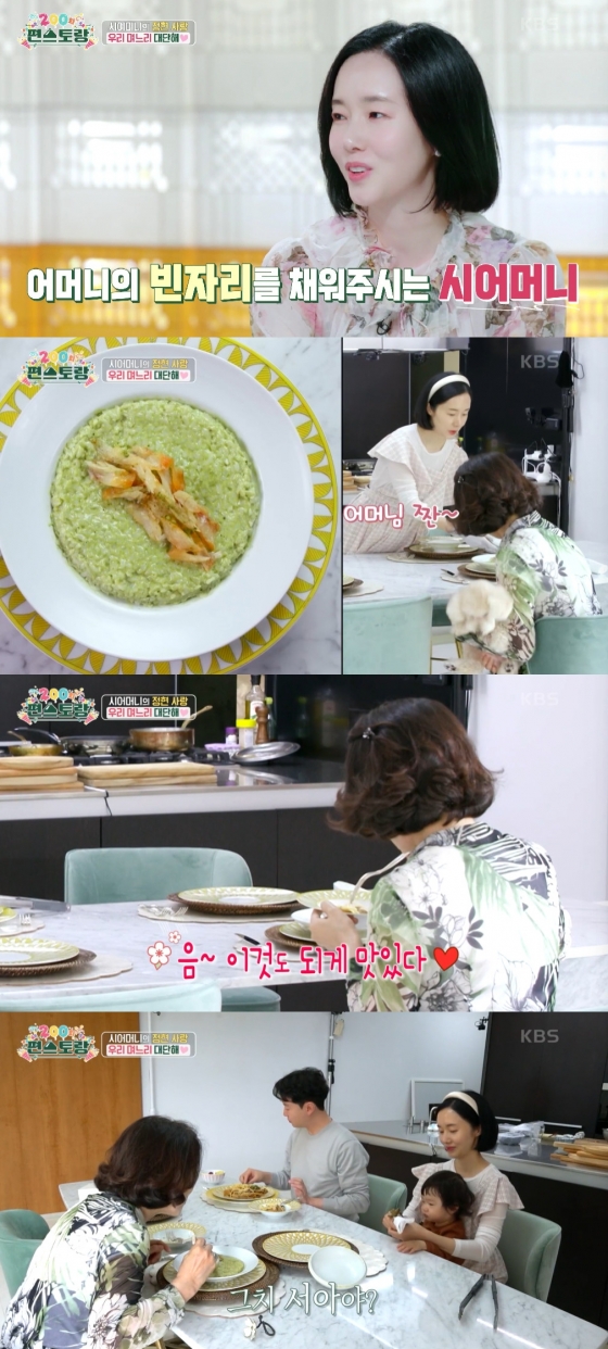 이어 이정현은 시어머니에게 보리굴비 리소토, 묵은지 삼겹 파스타 등을 대접했다. 이에 시어머니는 "나도 맛있지만 아버님이 더 좋아하시겠다. 안 그래도 네가 한 거 다 맛있다고 한다"며 "재료를 응용해서 새로운 요리가 나오는 게 신기하다"라고 말했다.